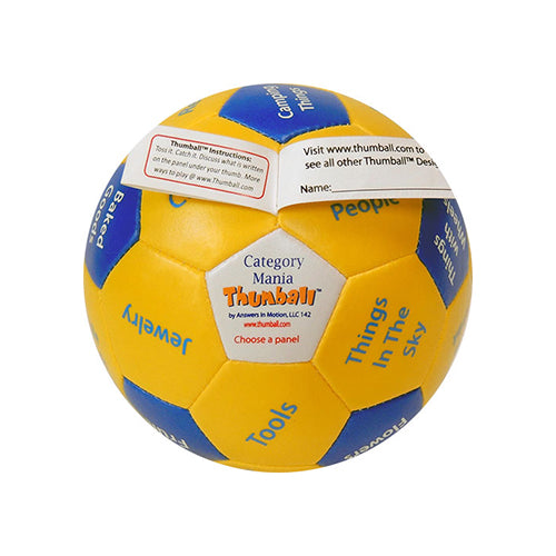 Yellow/Blue 32 panel Category Mania Thumball (4″). Speech & language activity improve language literacy and learning skills. Generate words in categories. Develop vocabulary word finding and memory skills. Beneficial way to organize the brain.