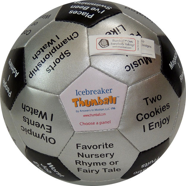 Silver/Black 32 panels Thumball(6″). The name says it all! One of the best Icebreakers ever! Learn more about yourself and others with participation in this team building activity. Allows adults of all ages to get to know each other. Great for parties at home out around town corporate trainings and team building counseling and therapy.