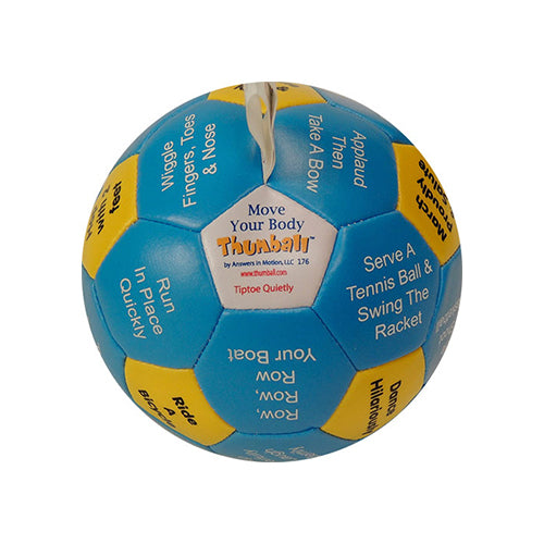 Teal/Yellow 32 panel Thumball (4″). All ages. Throw it. Catch it. Respond to the panel under your thumb. Increase physical activity by acting out the movements used when playing sports enjoying hobbies and performing exercises. Enhances co-ordination and activates muscle groups. Use sitting in a chair standing up or full body expression in the gym. Great prompts for charades and improvisational games.