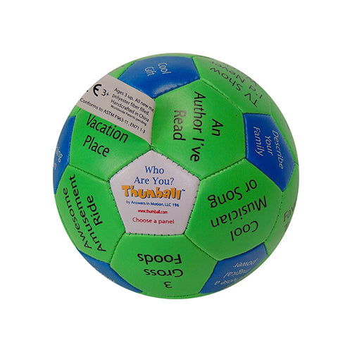Green/Blue 32 panel Thumball(4″). Fun innovative way for children to get acquainted. Stimulates social conversation and develops inter-personal communication skills. Showing interest in others by asking questions and actively listening to responses lays a foundation for friendships and improved relationships.